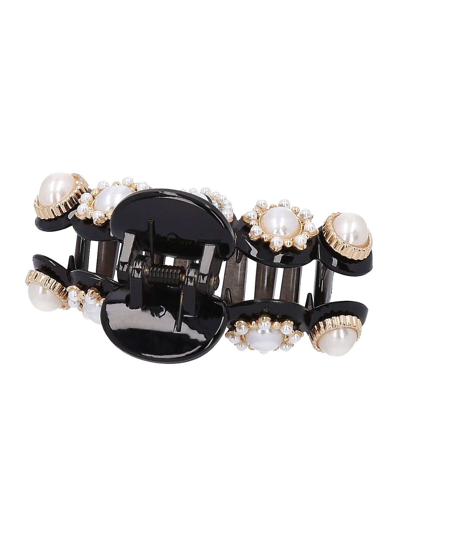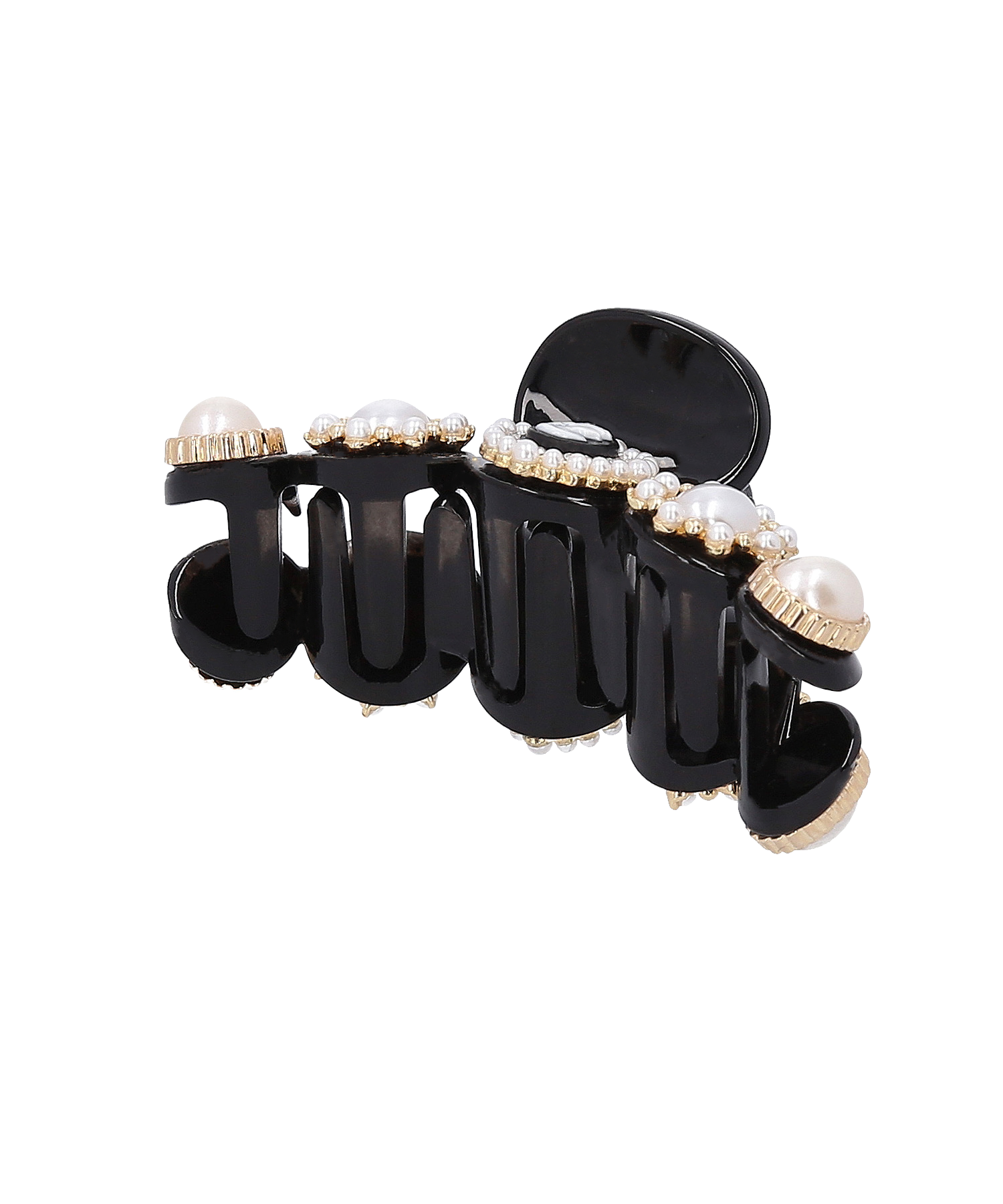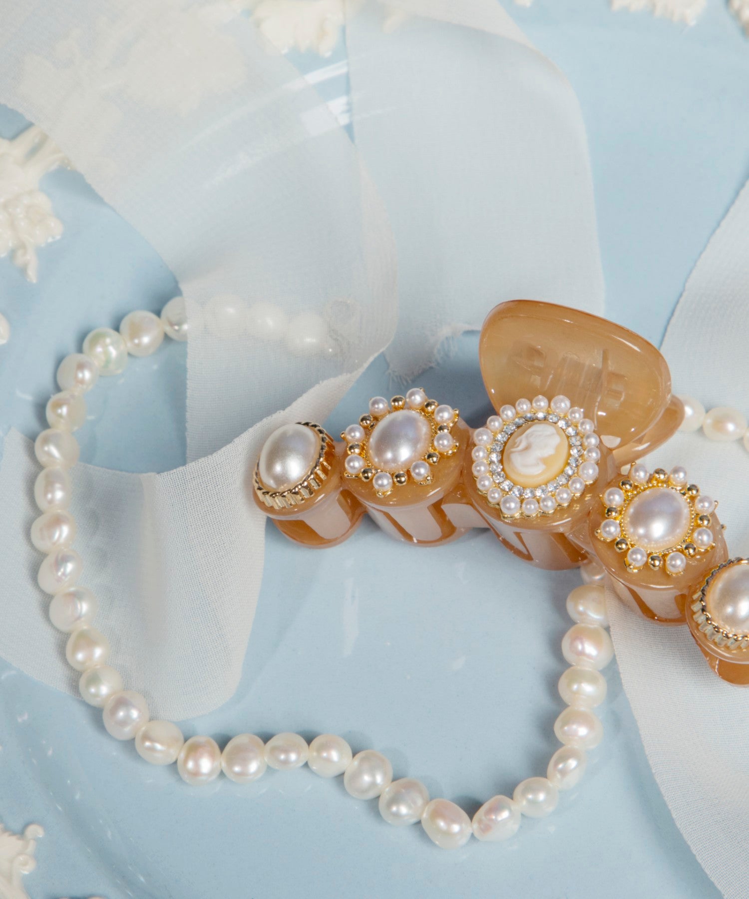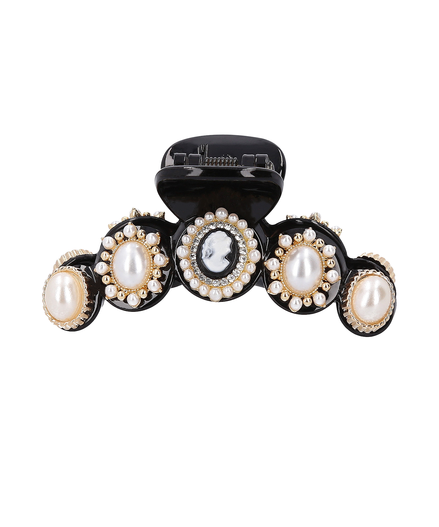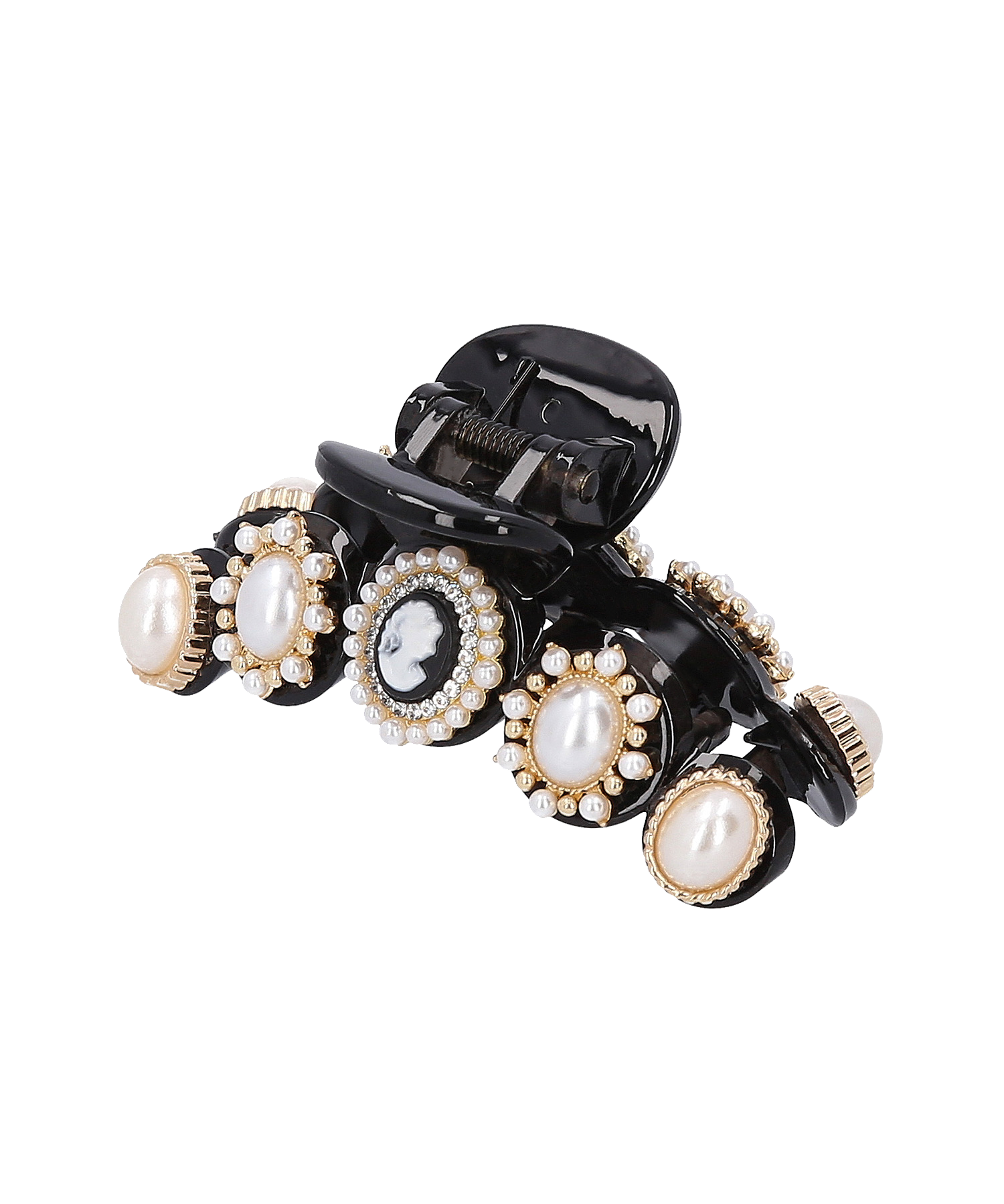 彫刻や浮彫りが施されたレジンカメオ、光沢感があり高級感漂うパールを組み合わせたデザインが特徴的なミニクリップです。