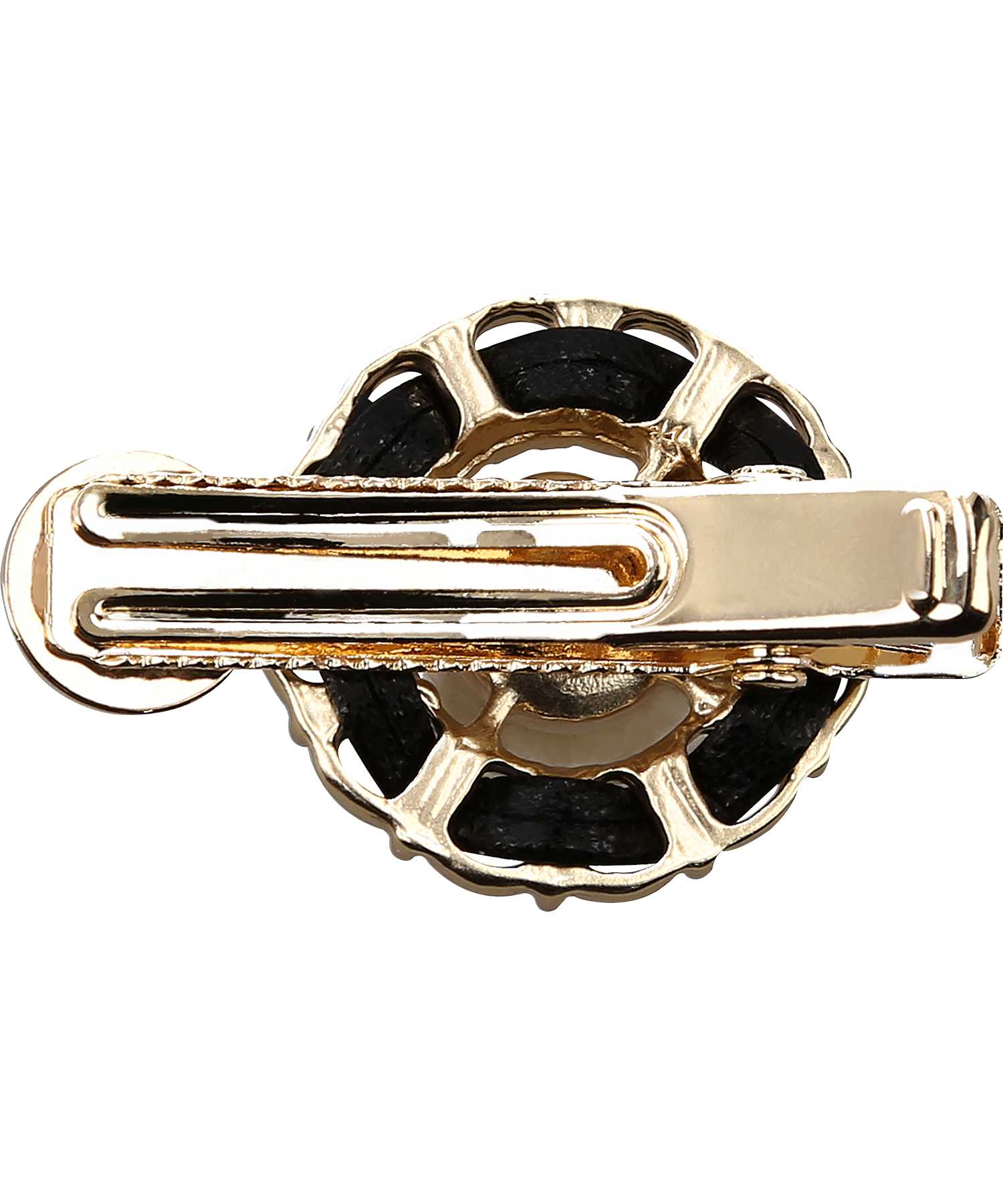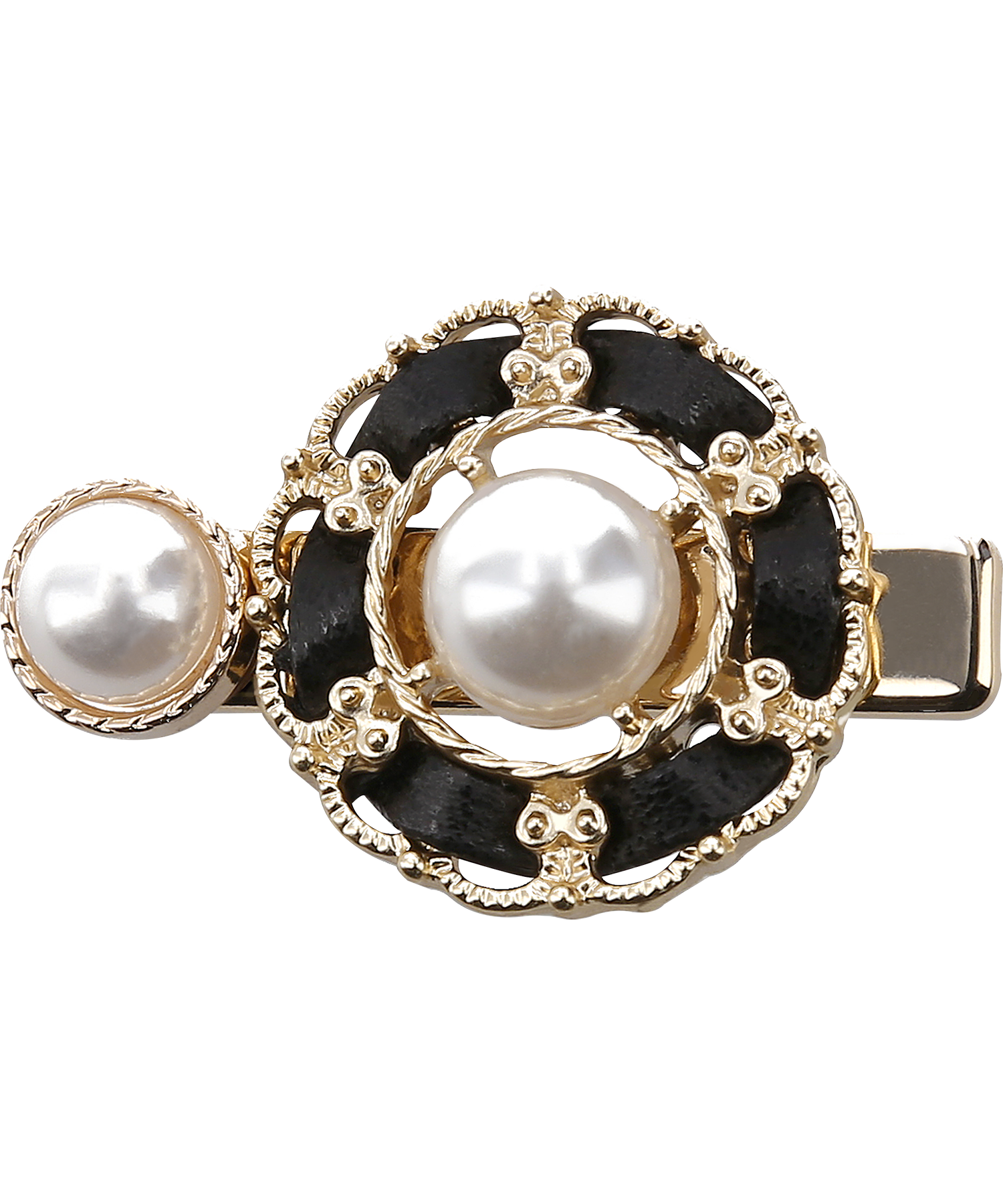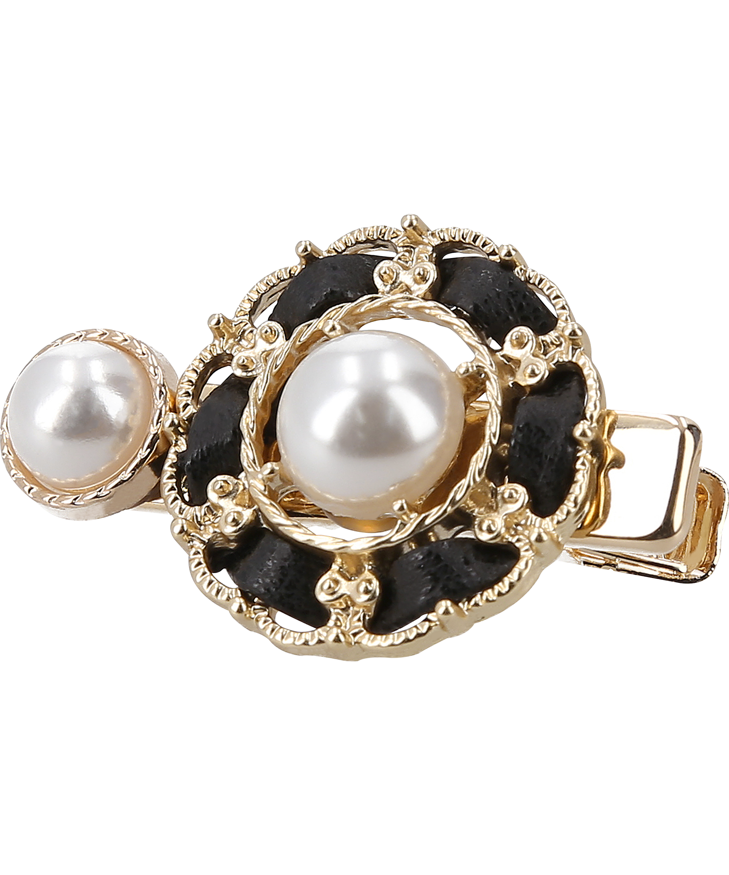 華やかな大粒パールとレザー、金メッキを組み合わせたデザインが特徴的なミニヘアピン。