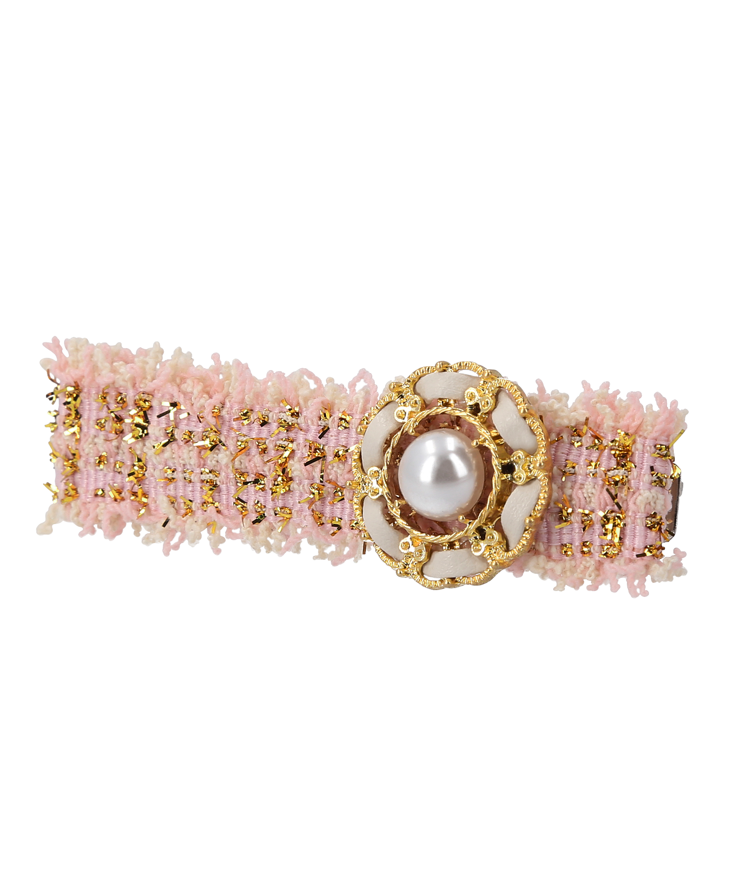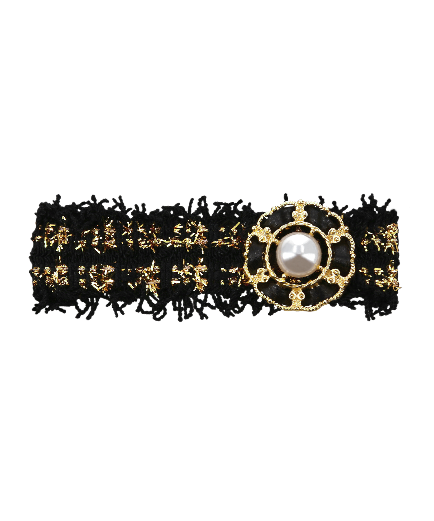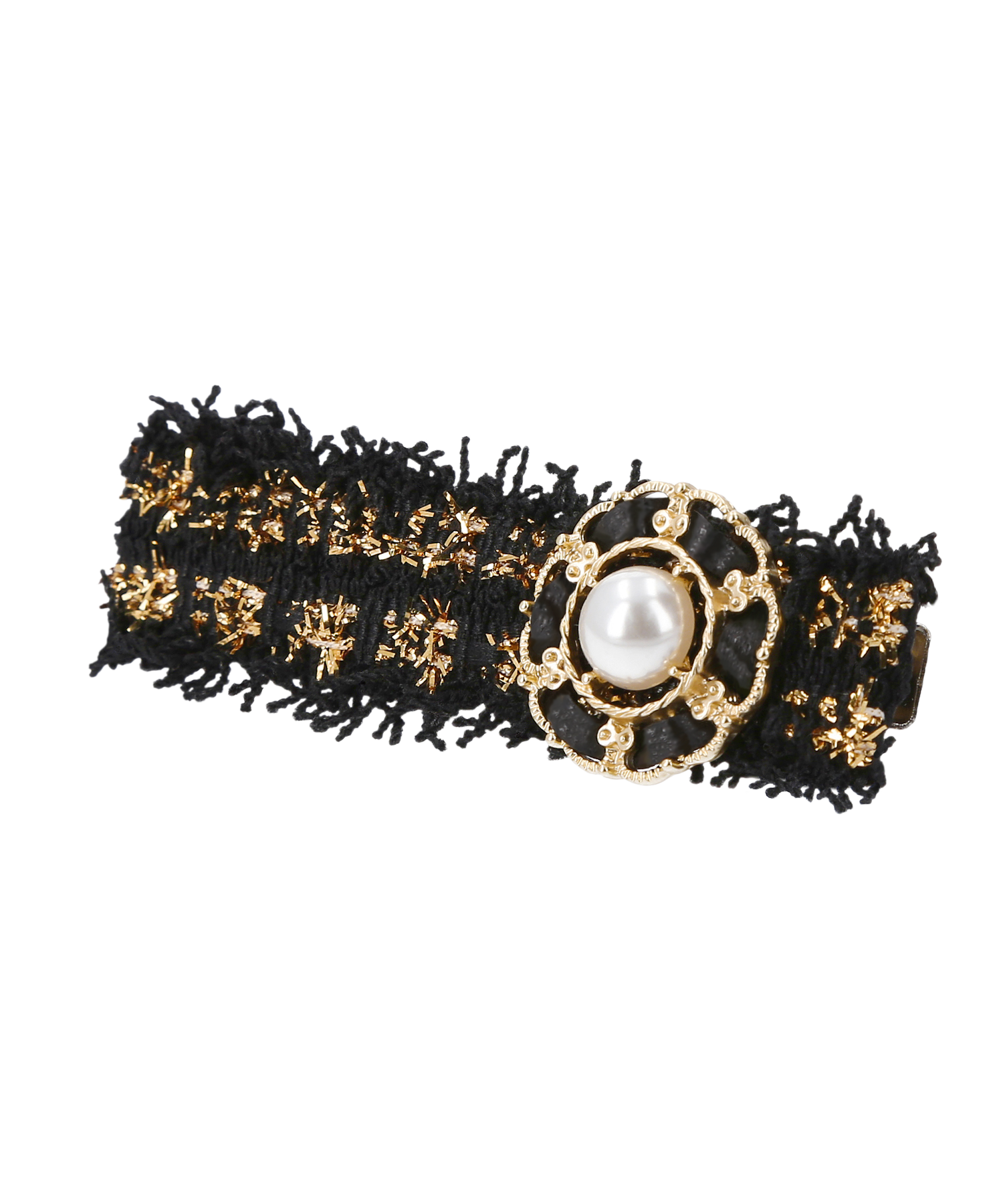 エレガントなレザーと輝くパールを組み合わせてワンポイントが施され、特別な日のヘアスタイルを華やかに彩ります。