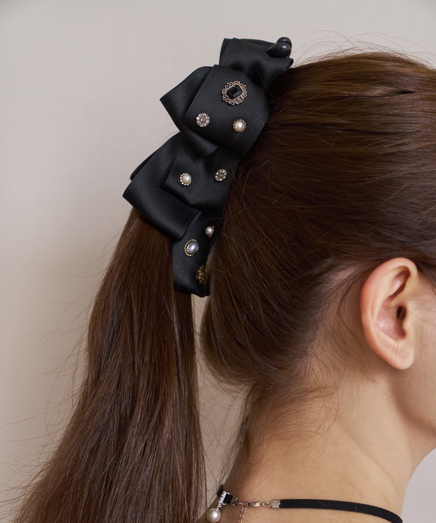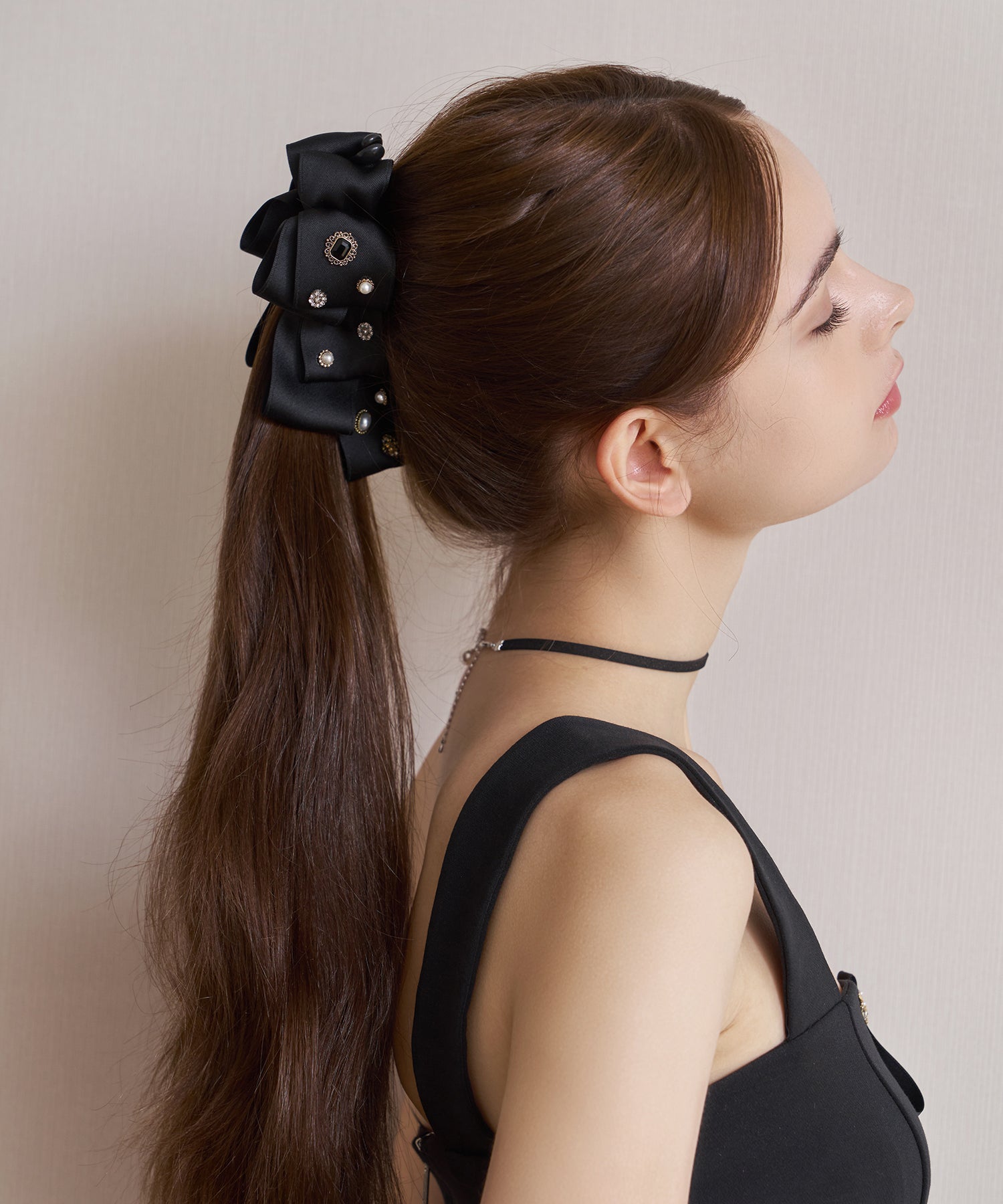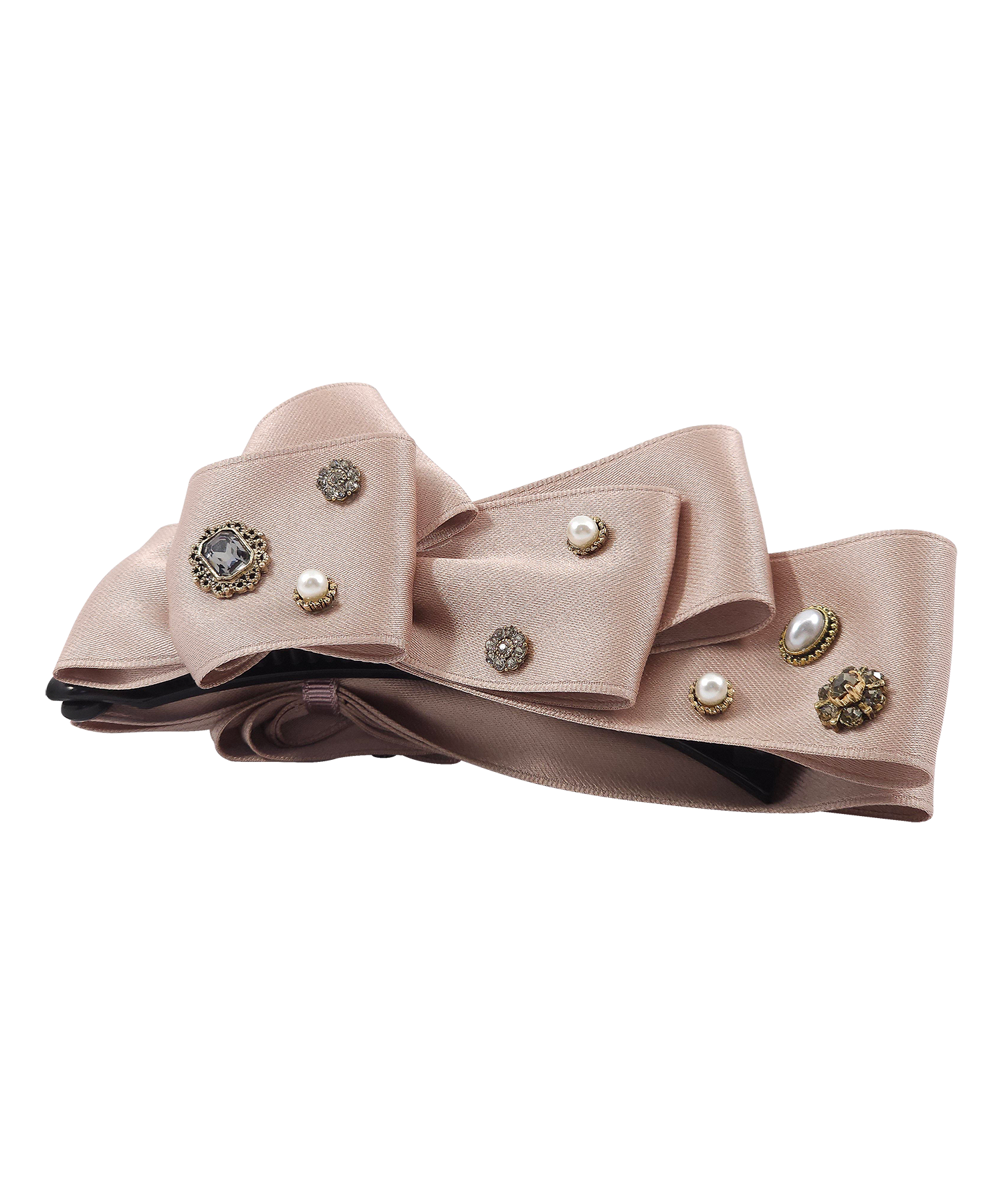 豪華なサテンリボンに、キラキラと輝くクリスタル、上品なパール、そして光を反射するガラスが散りばめられたビッグリボンバナナクリップ。