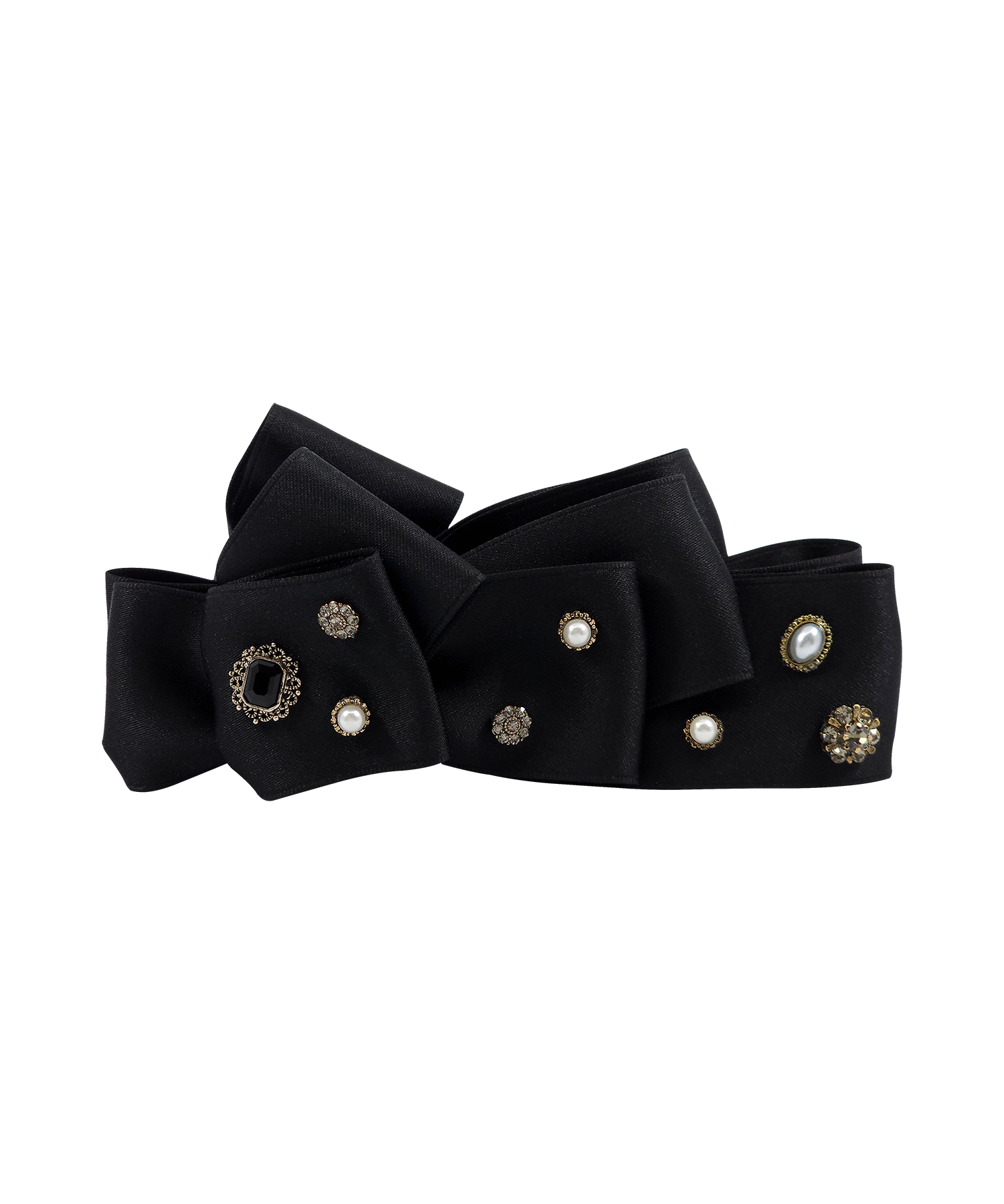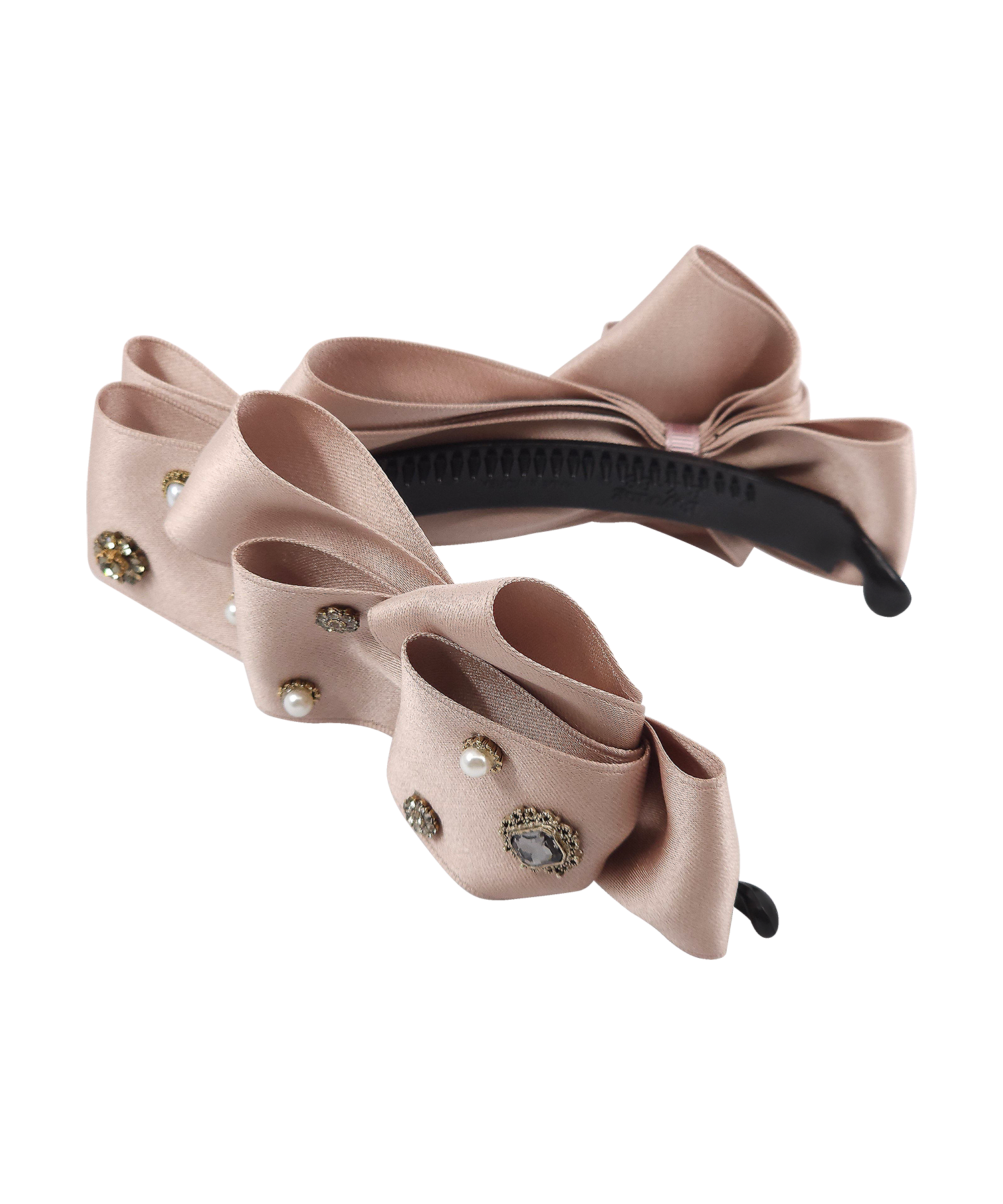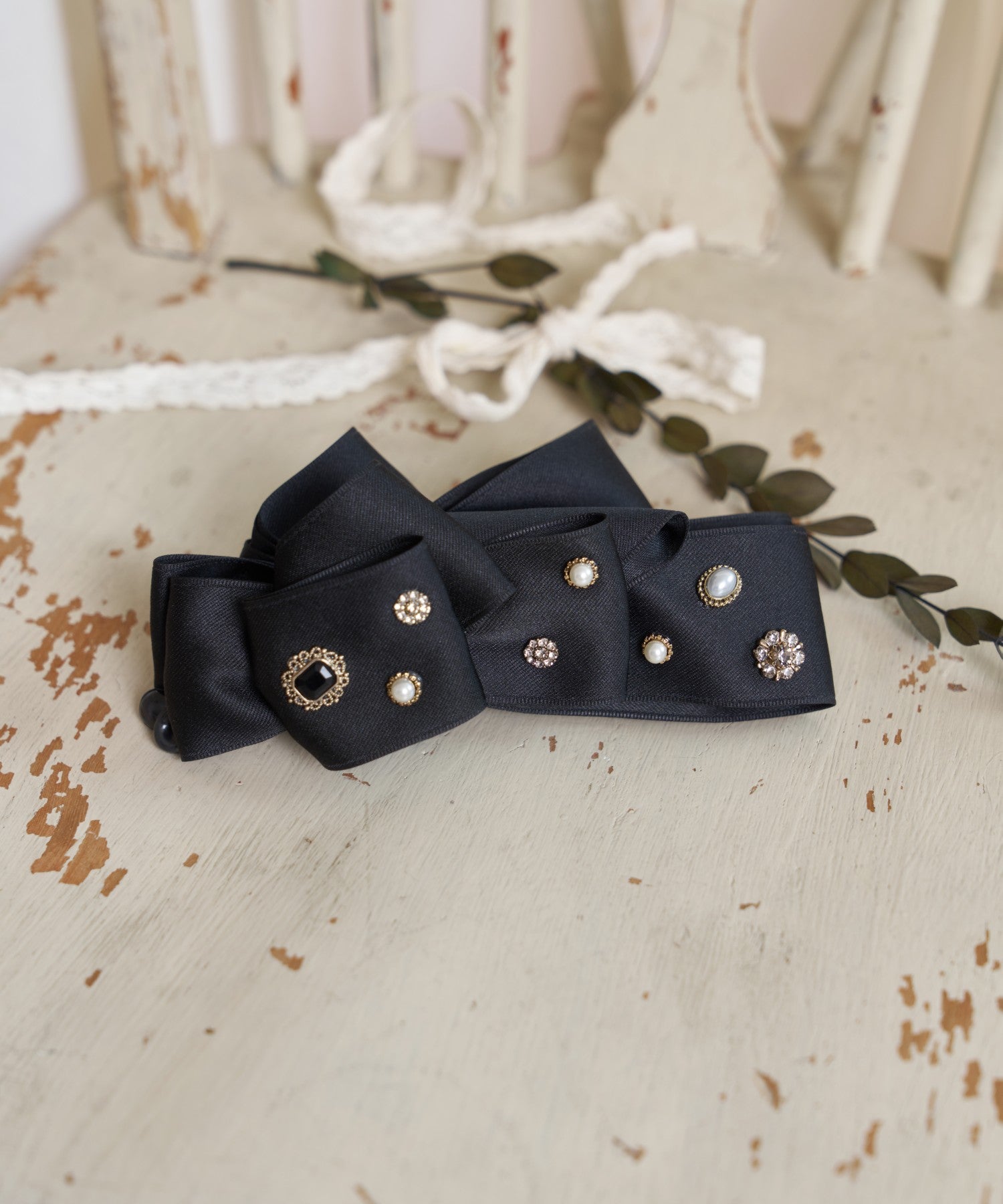 豪華なサテンリボンに、キラキラと輝くクリスタル、上品なパール、そして光を反射するガラスが散りばめられたビッグリボンバナナクリップ。